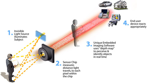 Il sistema brevettato da Canesta funziona essenzialmente come un radar, dove la distanza di oggetti remoti